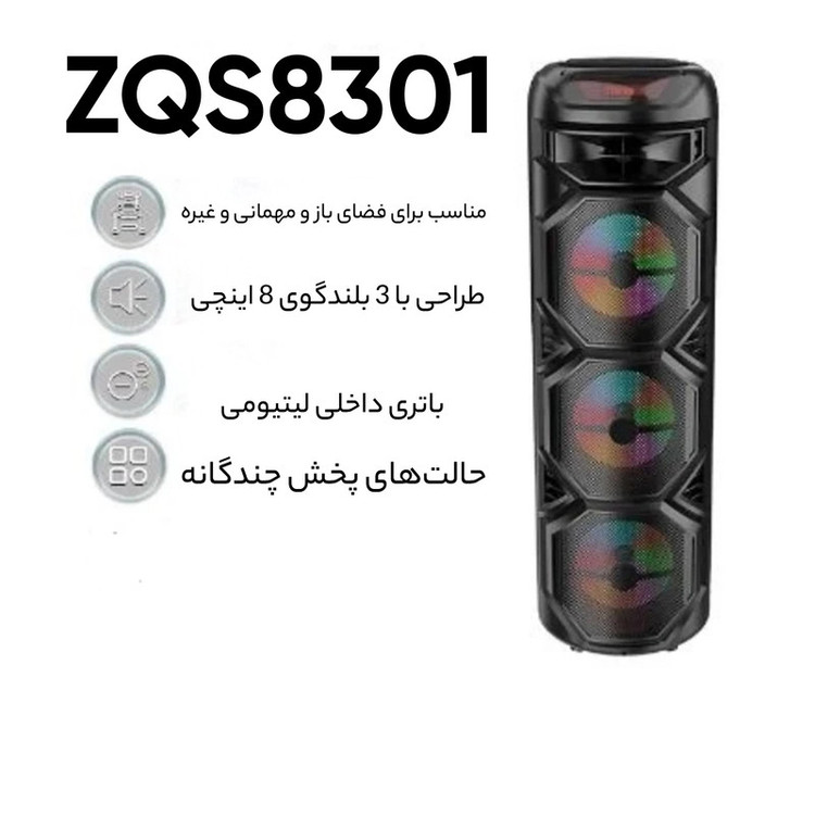 اسپیکر جدید سه ساب(سه باند) ZQS 8301 محصول جدید از شرکت ZQS که در ایران علاقمندان زیادی دارد این اسپیکر زیبا و باکیفیت دارای سه باند 8 اینچ است که همین امر باعث شده پرتاب صدای خوبی نسبت به اسپیکرهای 2 باند داشته باشد. طراحی شیک و زیبا با چرخهای روان باعث شده که شما بتوانید به راحتی آن را حمل کنید. یکی از مهمترین ویژگیهای این محصول جدید که داری میکروفون وایرلس(بیسیم) قابل شارژ با پورت TPC است که جدیدا اسپیکرهای شرکت zqs این قابلیت را اضافه کرده است. ریموت کنترل، کابل شارژ TPC, باطری 4500 میلیآمپر ساعت، توان خروجی 60 وات، اتصال کارت حافظه، USB.AUX و بلوتوث. این ویژگیها باعث شده که این محصول صدای باکیفیت،قیمت مناسب،جمع و جور،بیس نرم، برای شرکت در مجالس شادی و دورهمی خانوادگی شما عزیزان باشد.